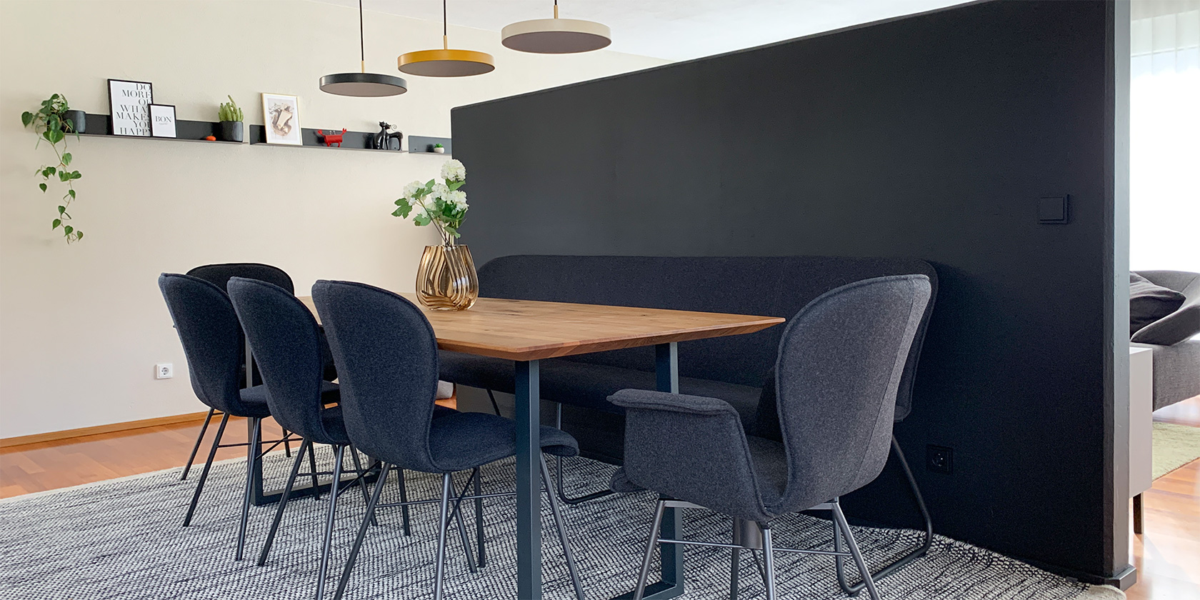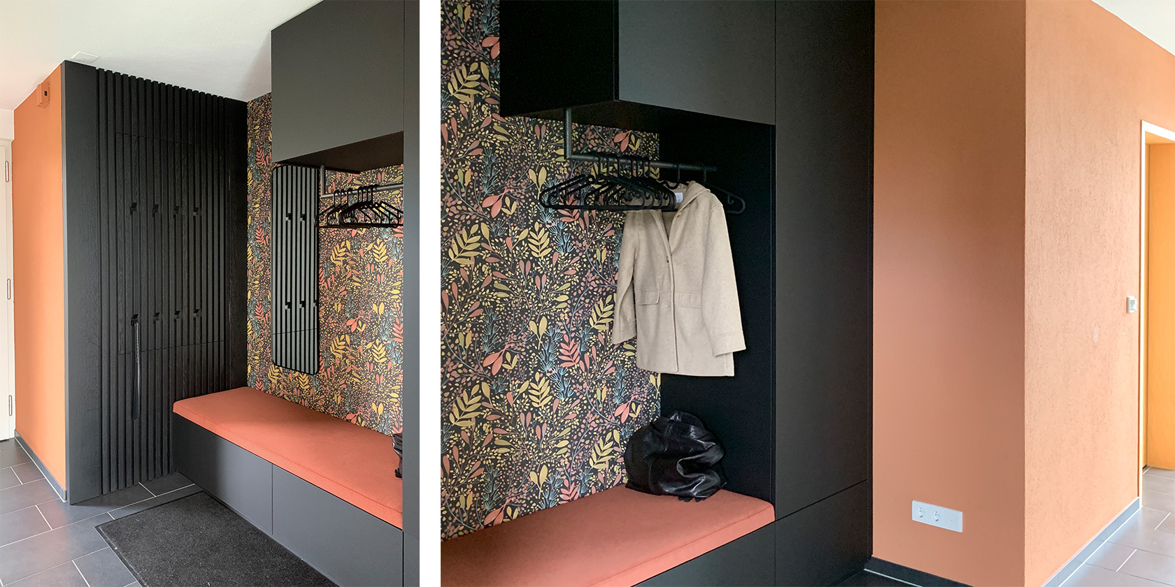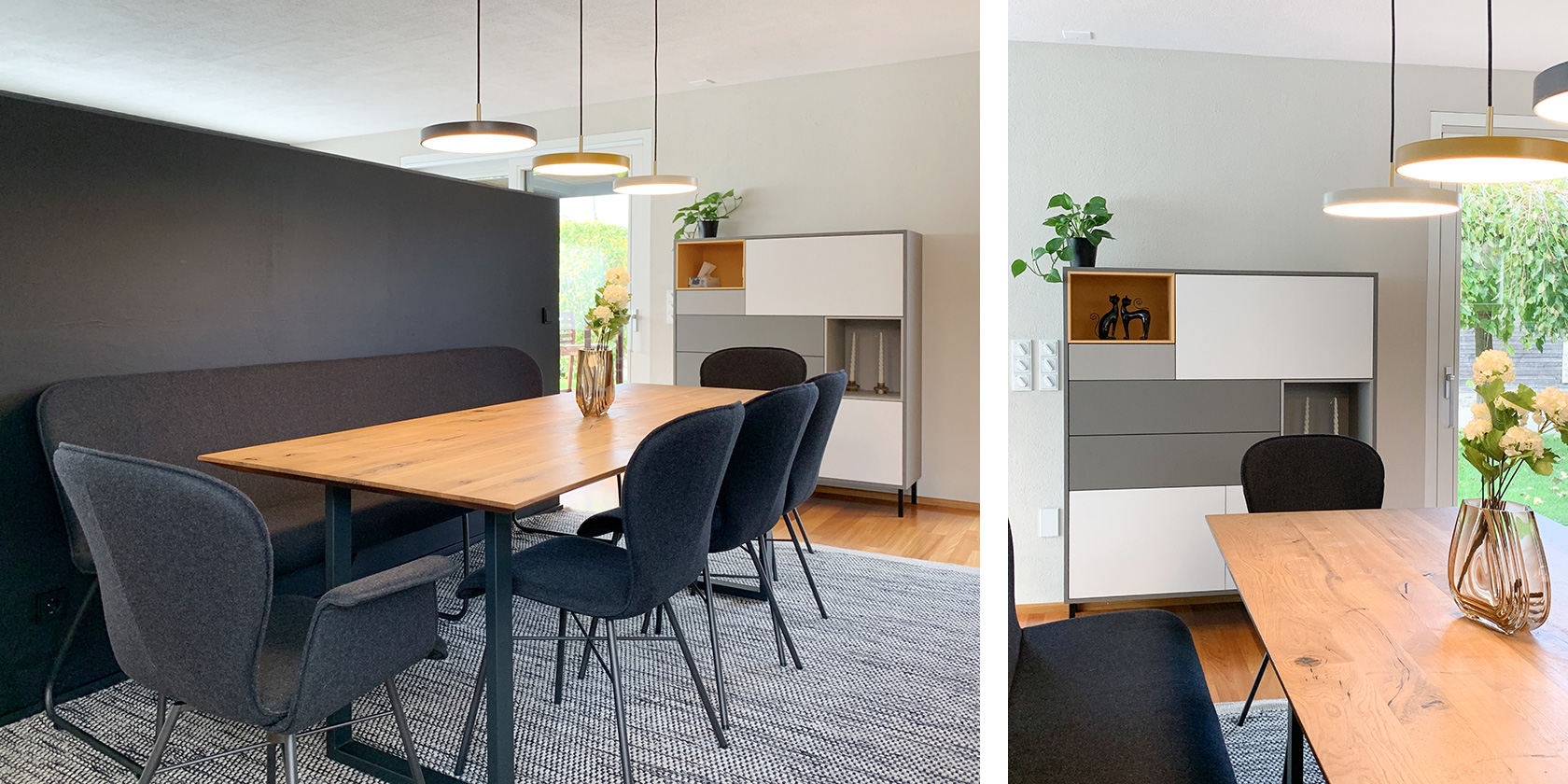 So wurden einzelne Möbelstücke neu entworfen, der Eingangsbereich klar strukturiert und ein Farbkonzept entwickelt, das neue, frische Akzente setzt. Der Mut der Kunden sich auf ein tiefes, zurückhaltendes Schwarz einzulassen, hat sich gelohnt. Nun wirken die bewusst eingesetzten Farben frischer und leuchtender.