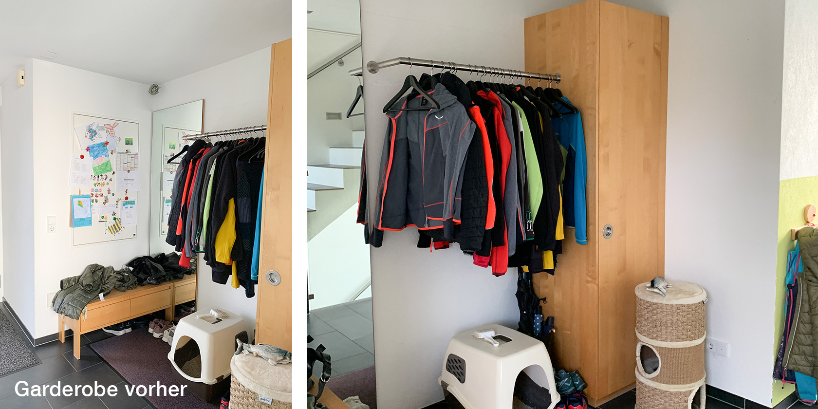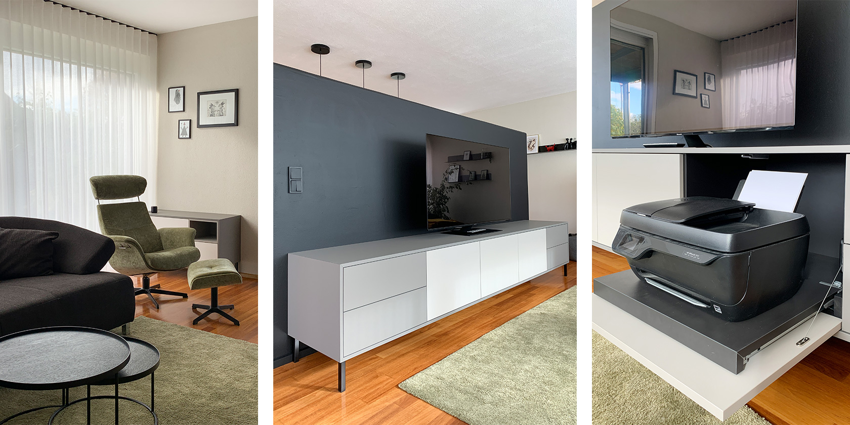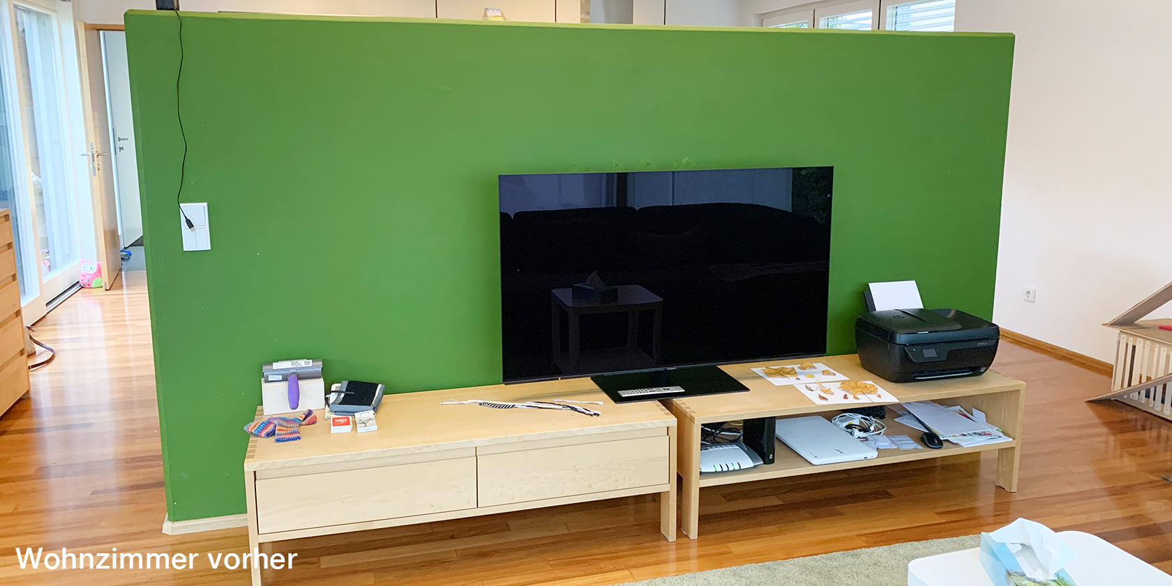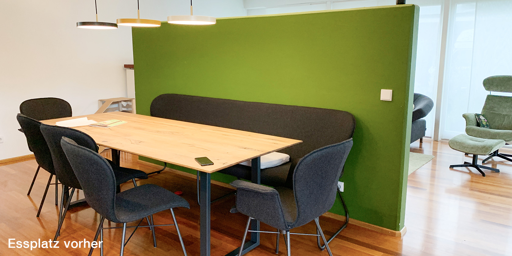 Die Familie hat sich inzwischen am dominanten grasgrünen Wandelement sattgesehen und der Wunsch nach einem stimmigen Gesamtkonzept wurde lauter.