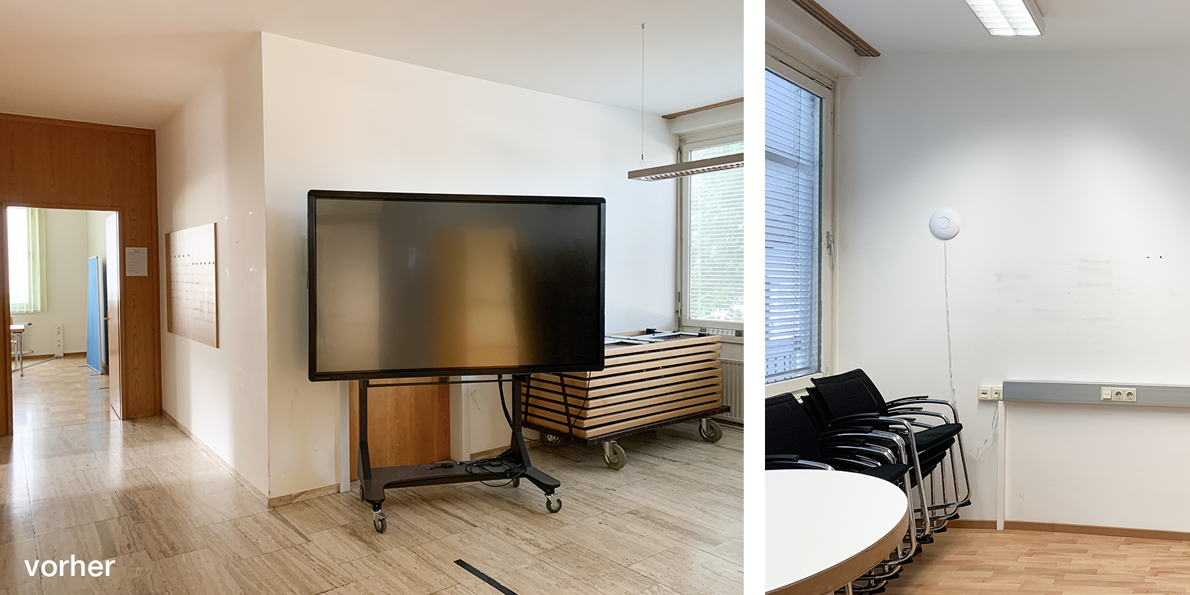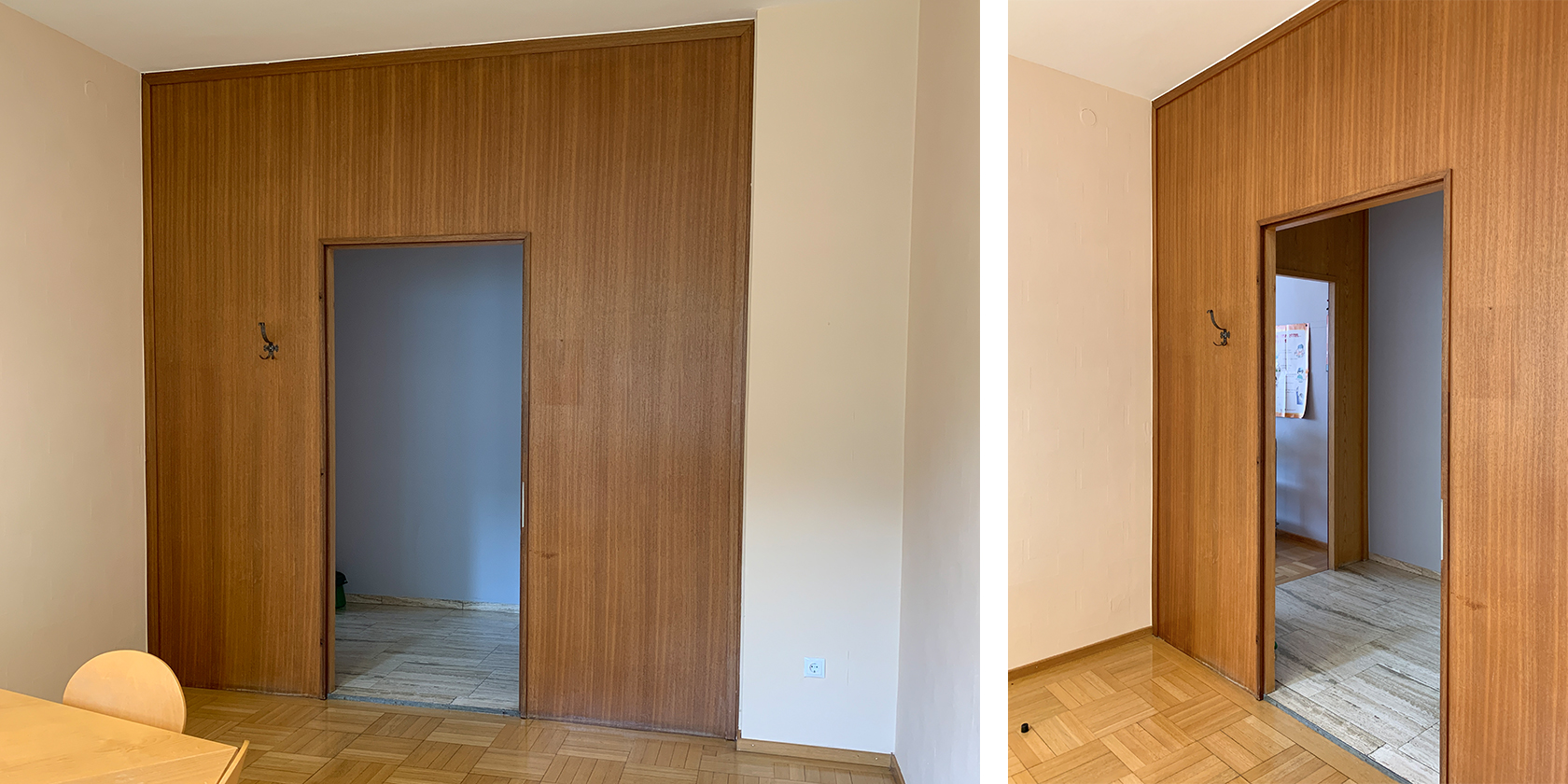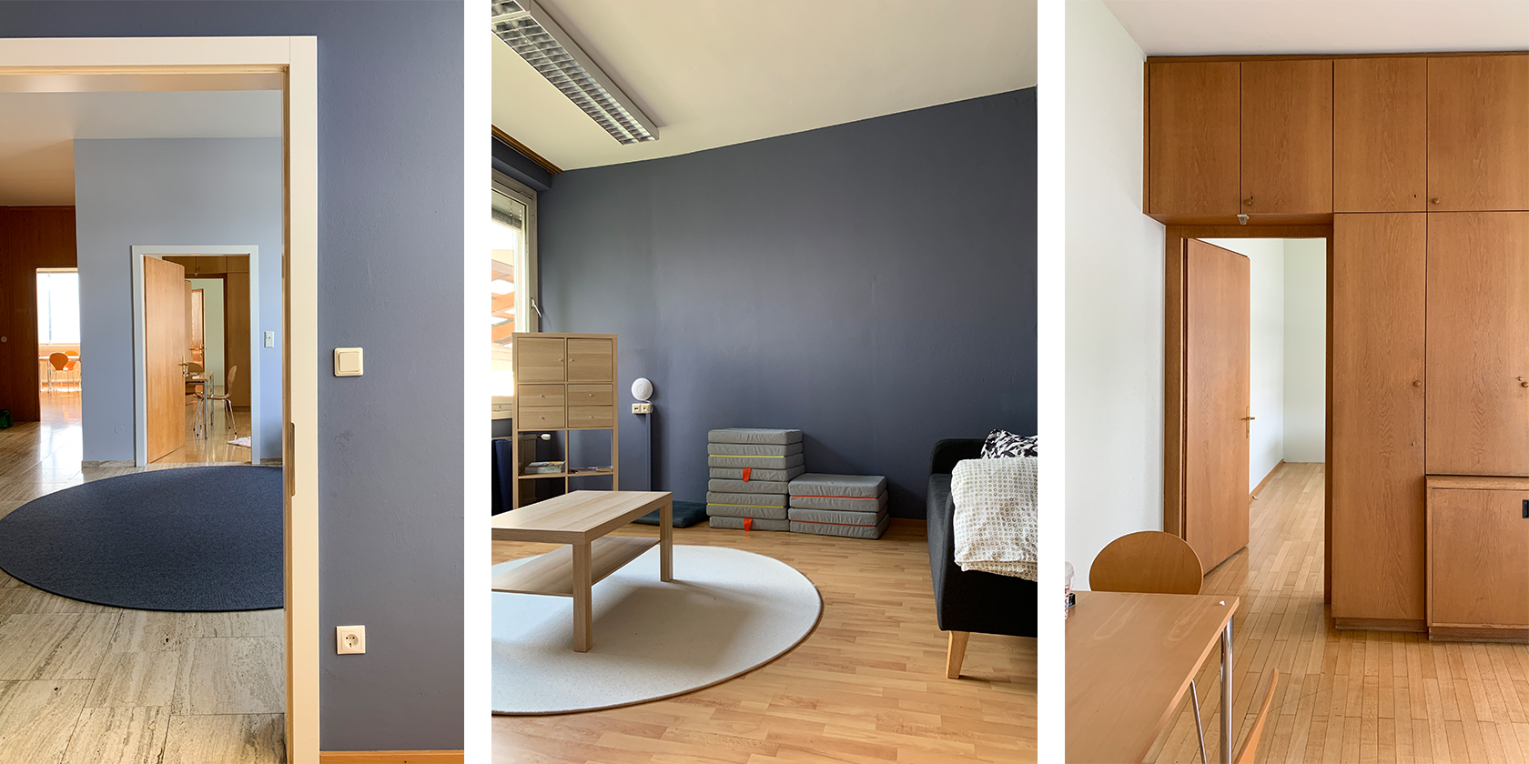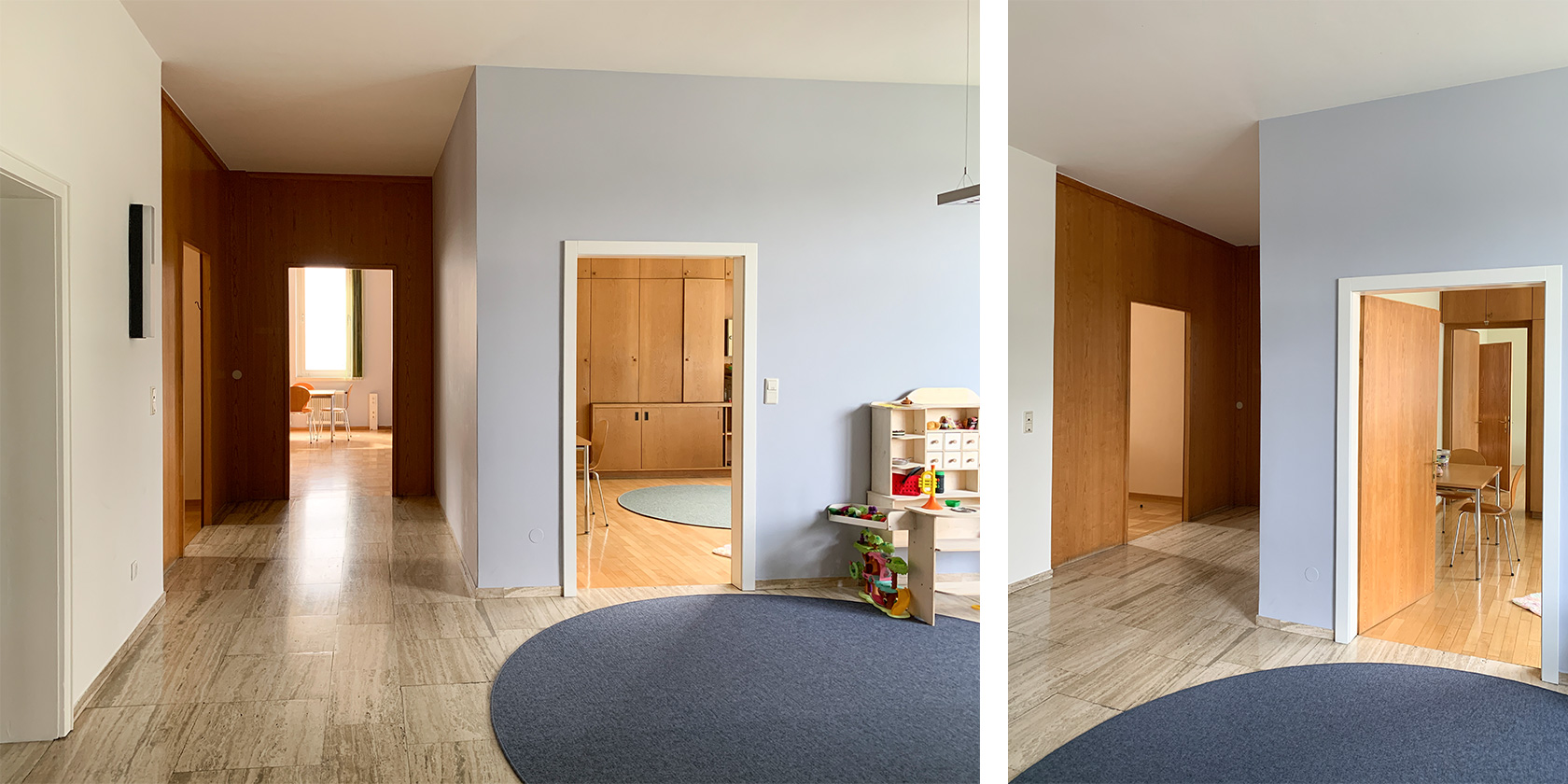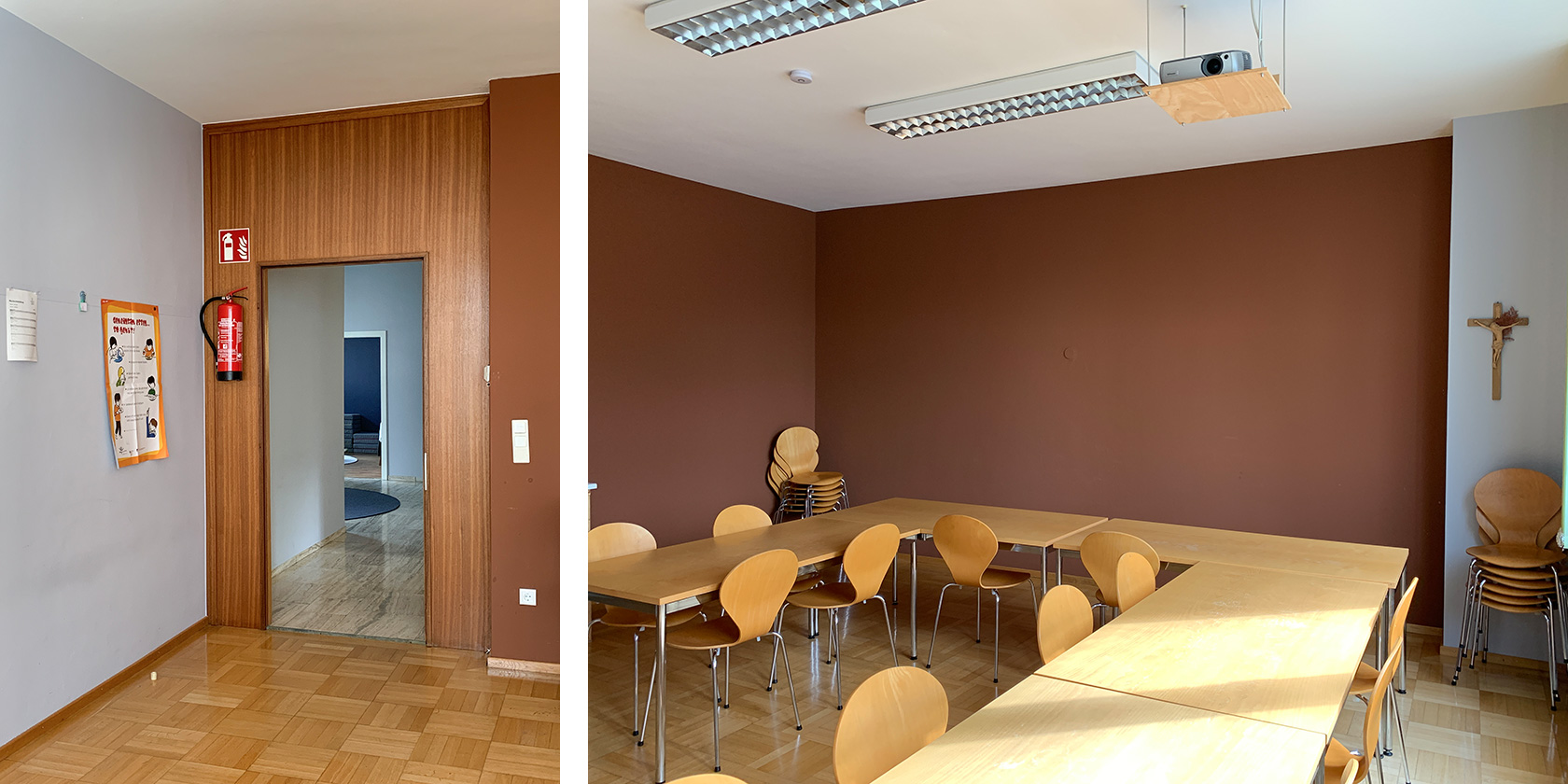 Das in den 60er-Jahren erbaute alte Gemeindeamt wird nun der Schülerbetreuung zur Verfügung gestellt. Alle Räumlichkeiten wurden seit ihrem Bestehen kaum verändert und weisen teilweise noch die ursprünglichen Bodenmaterialien, Türen und Einbaumöbel auf. Die hohen Räume mit den weißen Wänden, steifen Lamellenvorhängen und technischer Beleuchtung schaffen eine nüchterne Büroatmosphäre.